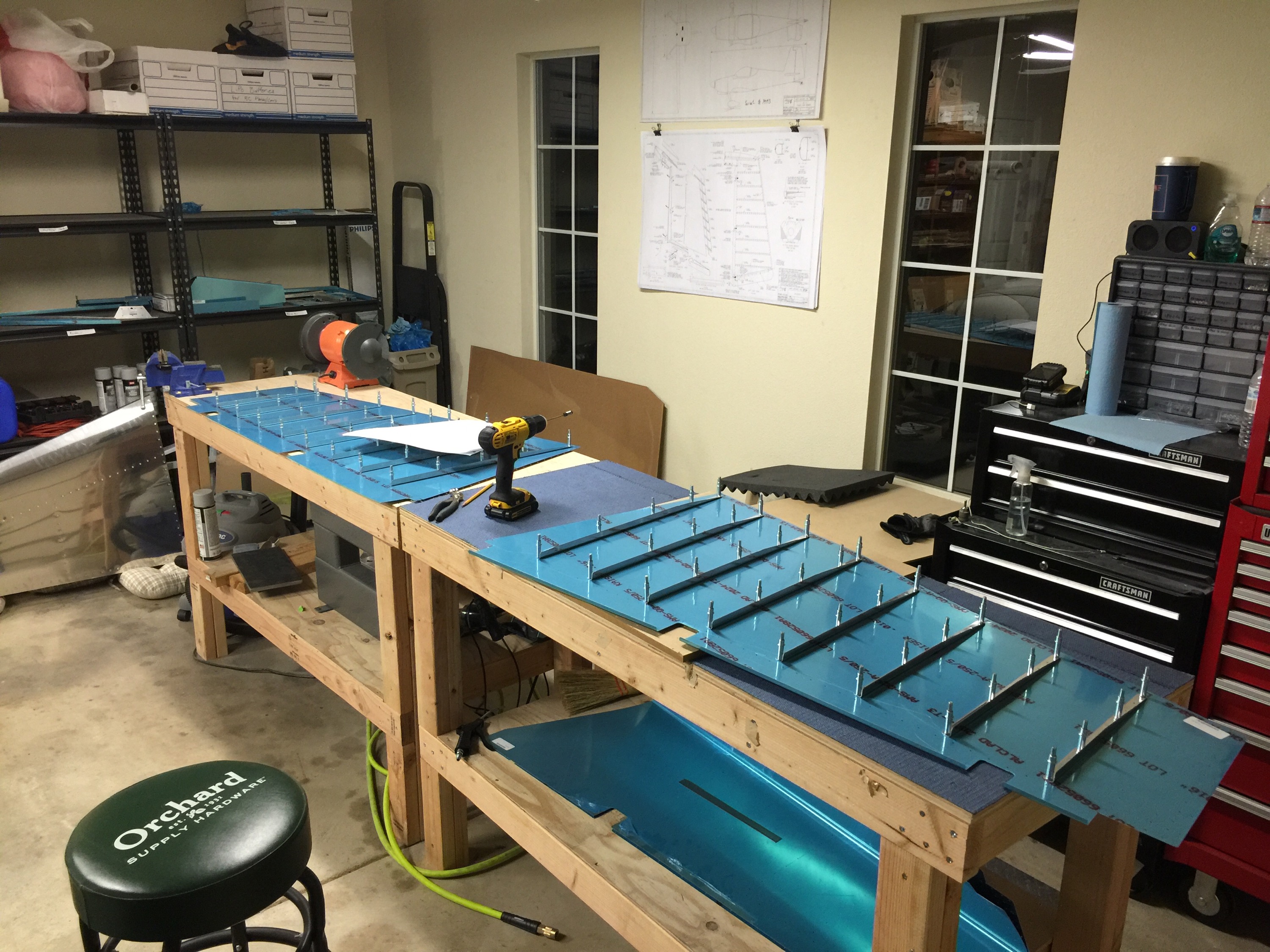 I didn’t grab any pictures, but I also scuffed, cleaned, and primed all the stiffeners and the interior of the skins along the rivet holes. Next step is to back rivet the stiffeners to the skins but it was getting too late to get out the rivet gun.