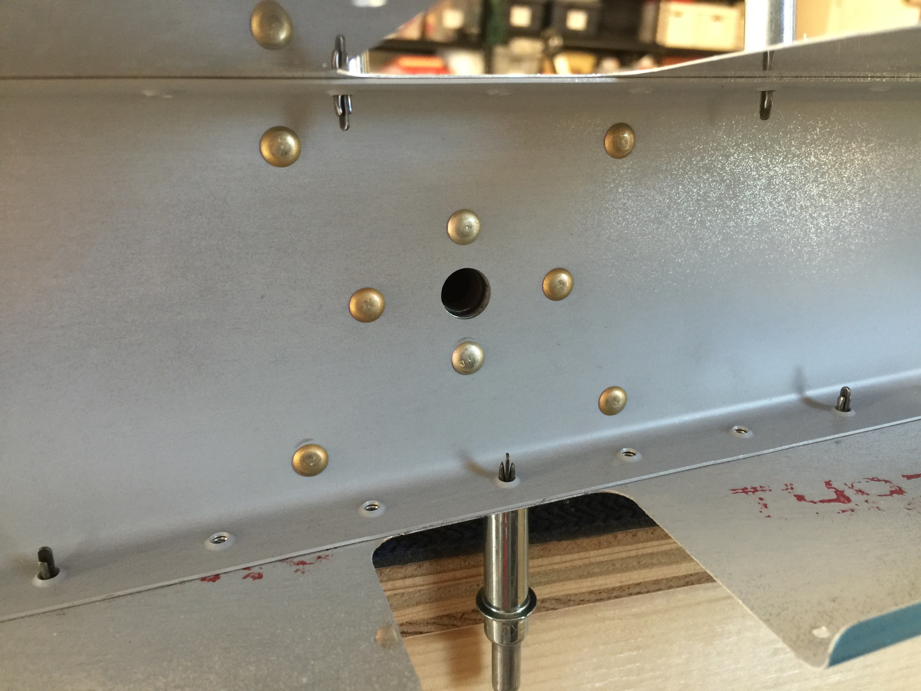 Here you can see the rivets on the reinforce the plate and the spar. The three reinforcement plate are all very similar. The hole in the center has a nut-plate riveted as well, this will accept the rudder hinges.
