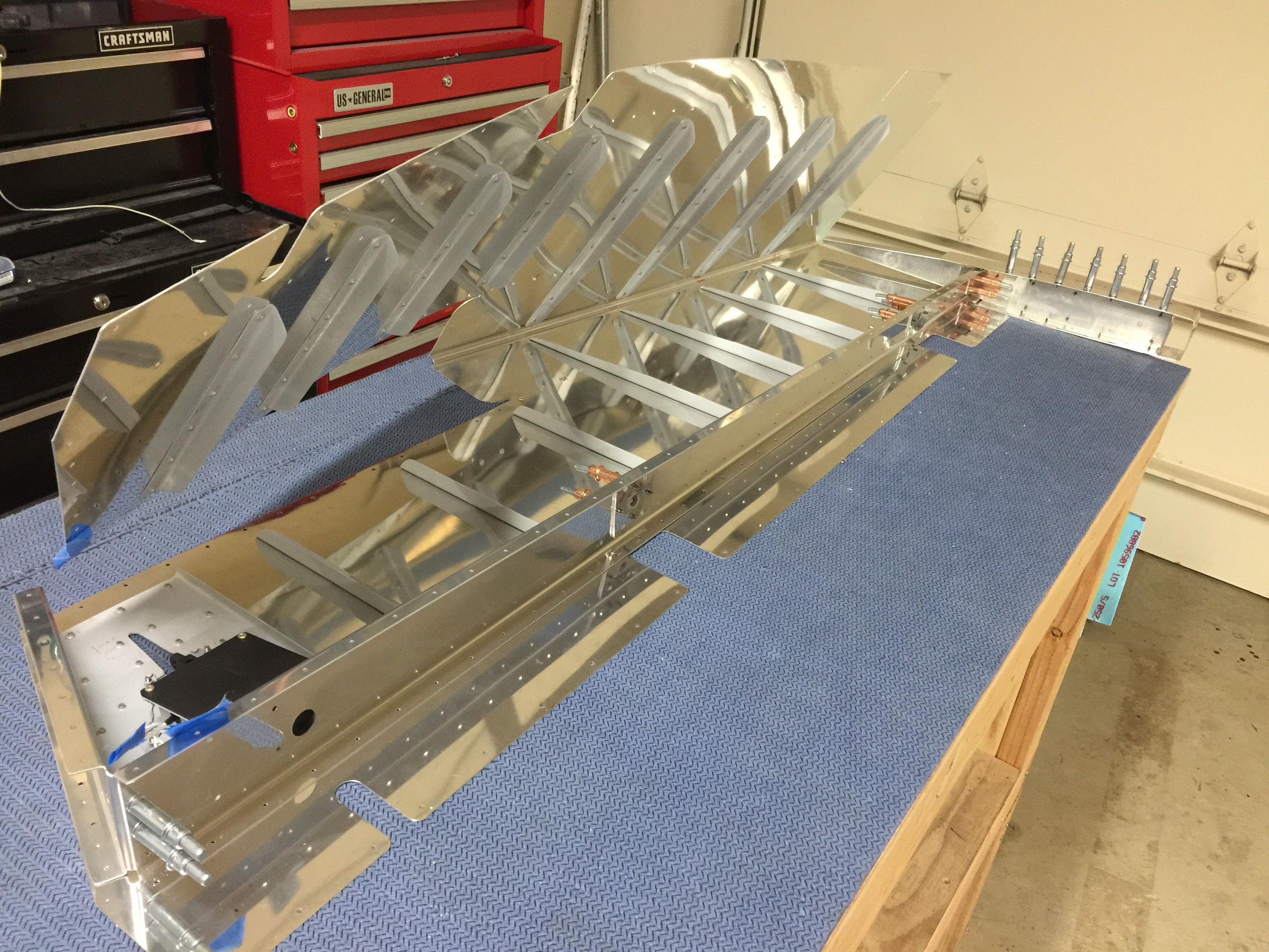 Here is the skeleton laid out in the left elevator skin, I’ve already drilled and prepped both elevator counterbalance weights and have set them aside. Next step is to bend the trailing edges of the skins so I can match drill the skins to the under structure.