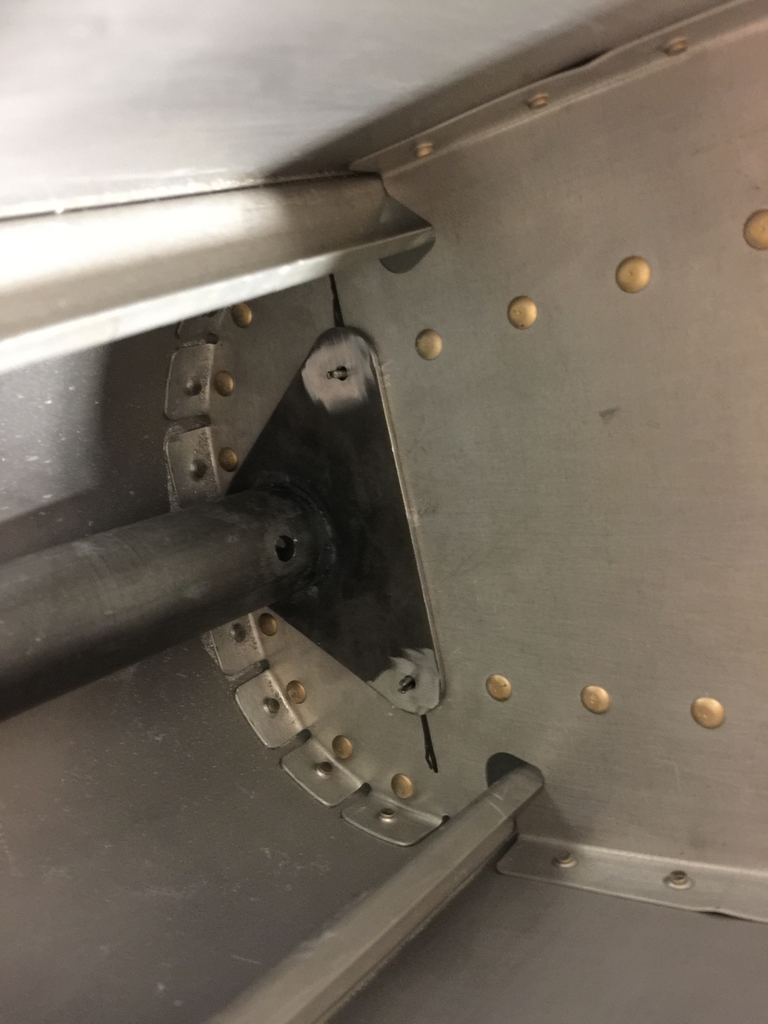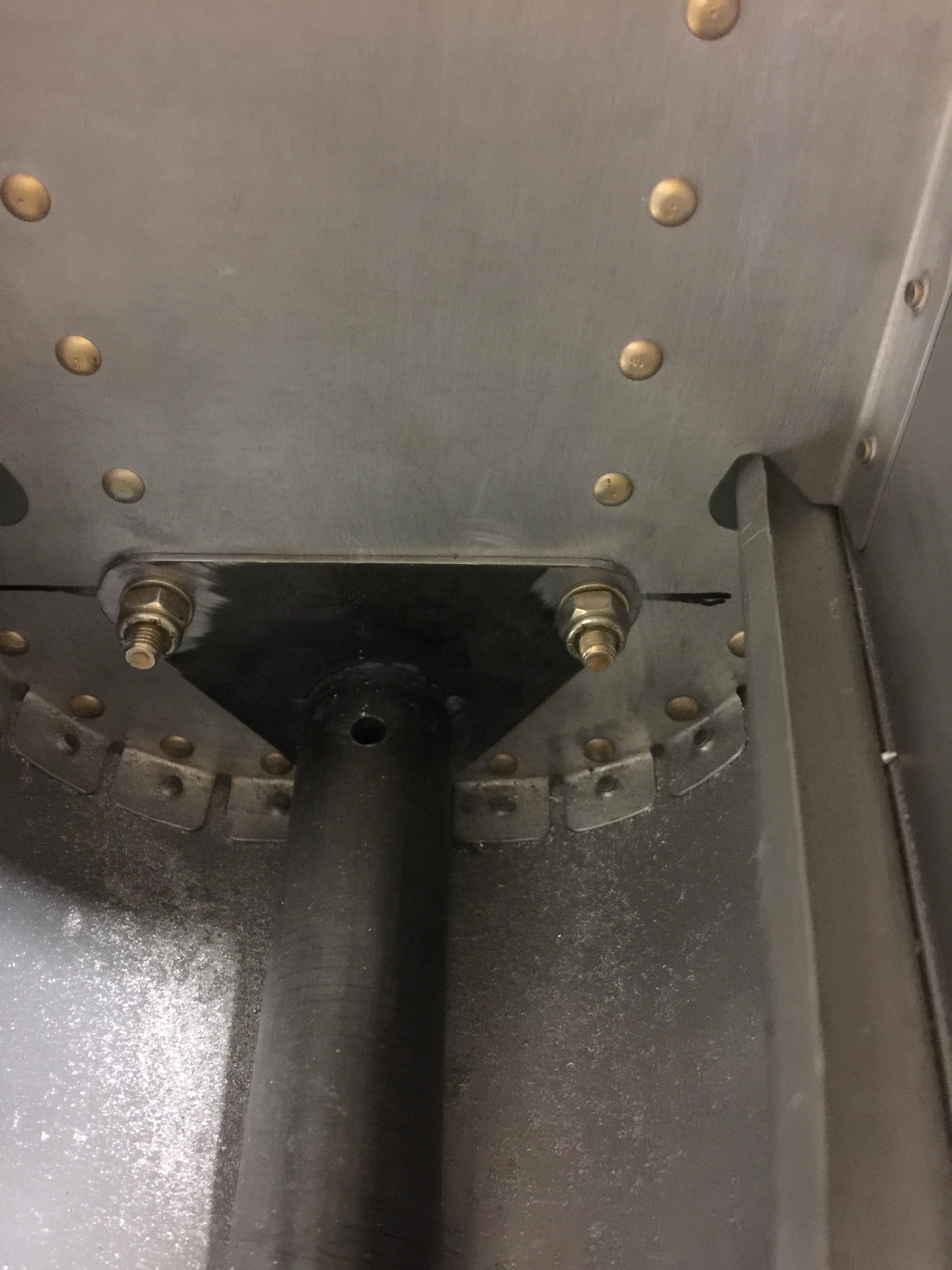After measuring and aligning multiple times, I enlarged the initial holes to final size for the AN4 bolt. The steel is substantially more difficult to drill through than the aluminum. I also drilled a hole in the bottom of the fuse skin to allow access for a socket wrench to reach the bolt that will bolt the tail wheel spring in the mount (that’s the hole in the weldment). Next up is to remove the weldment, surface prep and the prime it and install it permanently.