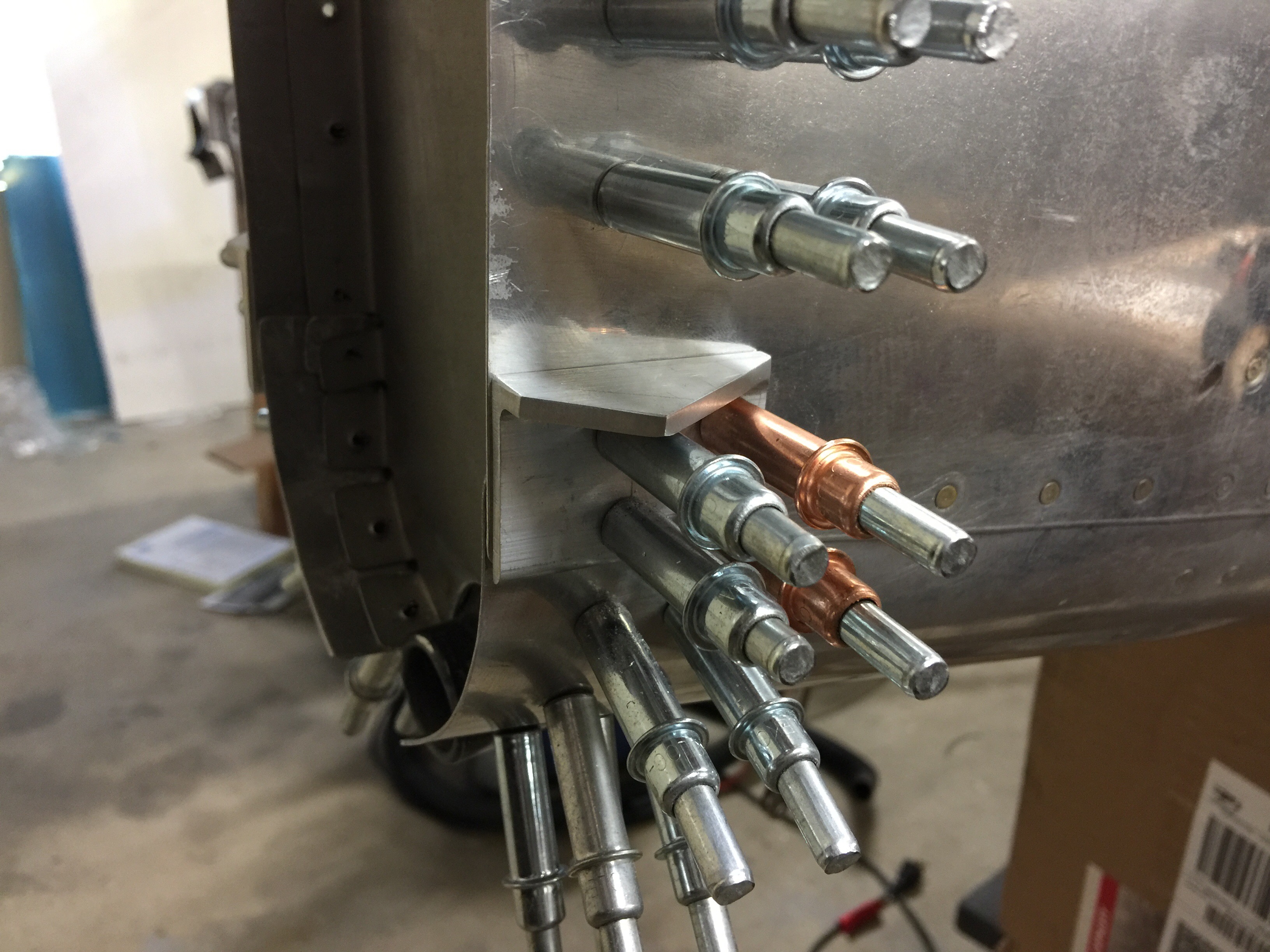 Here’s the weldment aligned and drilled to match the bulkhead. These were measured and originally drilled to #30 so that I could hold it in place with clecos.