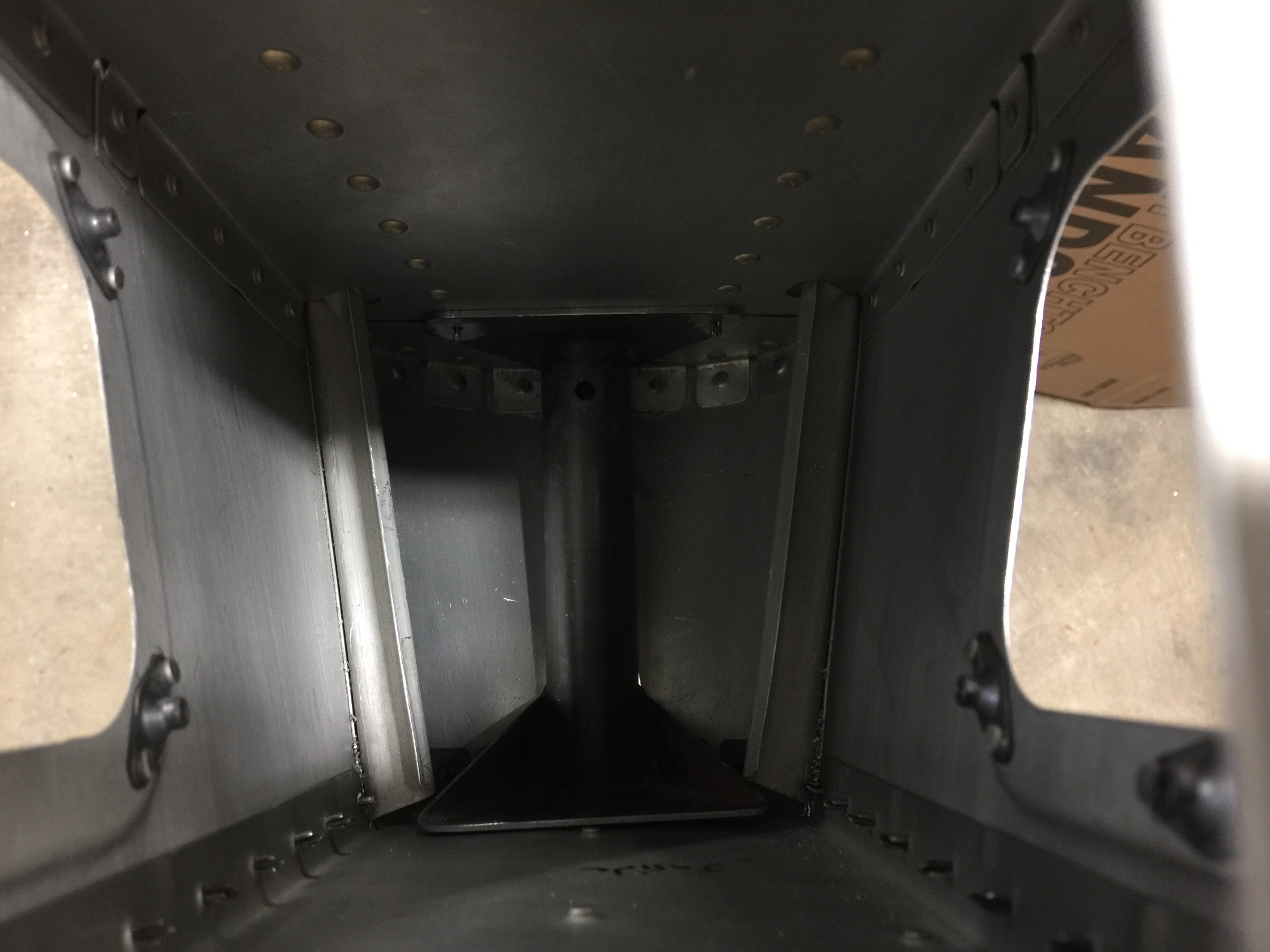 Here’s the mount sandwiched between the two bulkheads. This is looking in from the top of the tail cone. It’s a bit hard to see but there’s a very small gap between the weldment and the aft most bulkhead. I’ll fabricate a wedge out of some scrap aluminum and it will fill the gap.