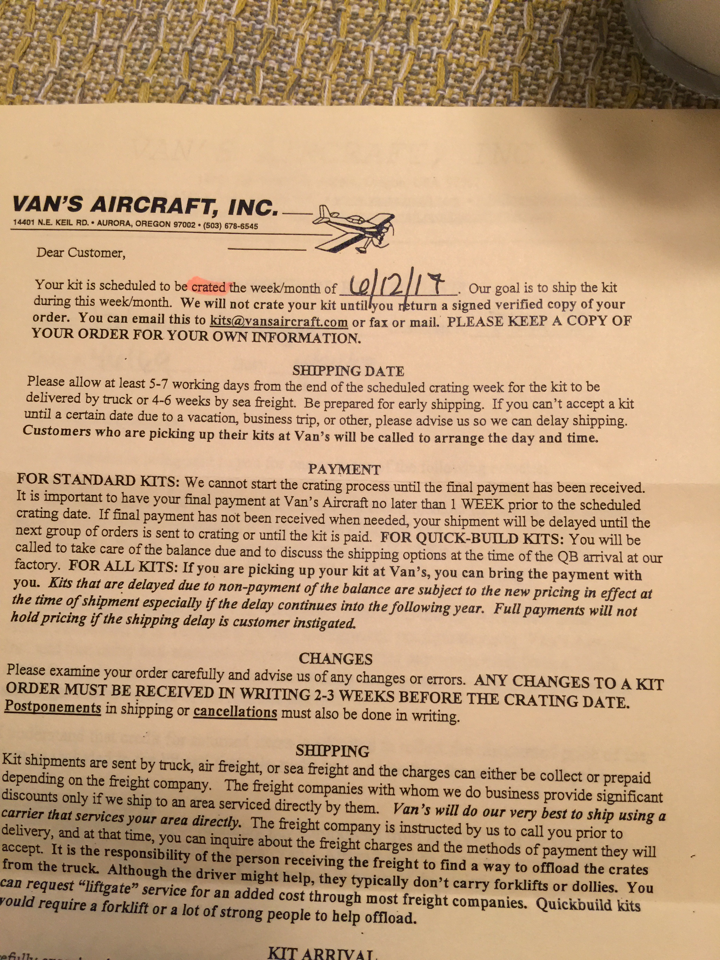 Today I came home to a lovely piece of mail. I received my confirmation and approximate shipping date! If I assume the earliest shipping, that gives me just about 6 weeks before I get it. There’s plenty to do, but it should be plenty of time t finish everything that needs to be done.