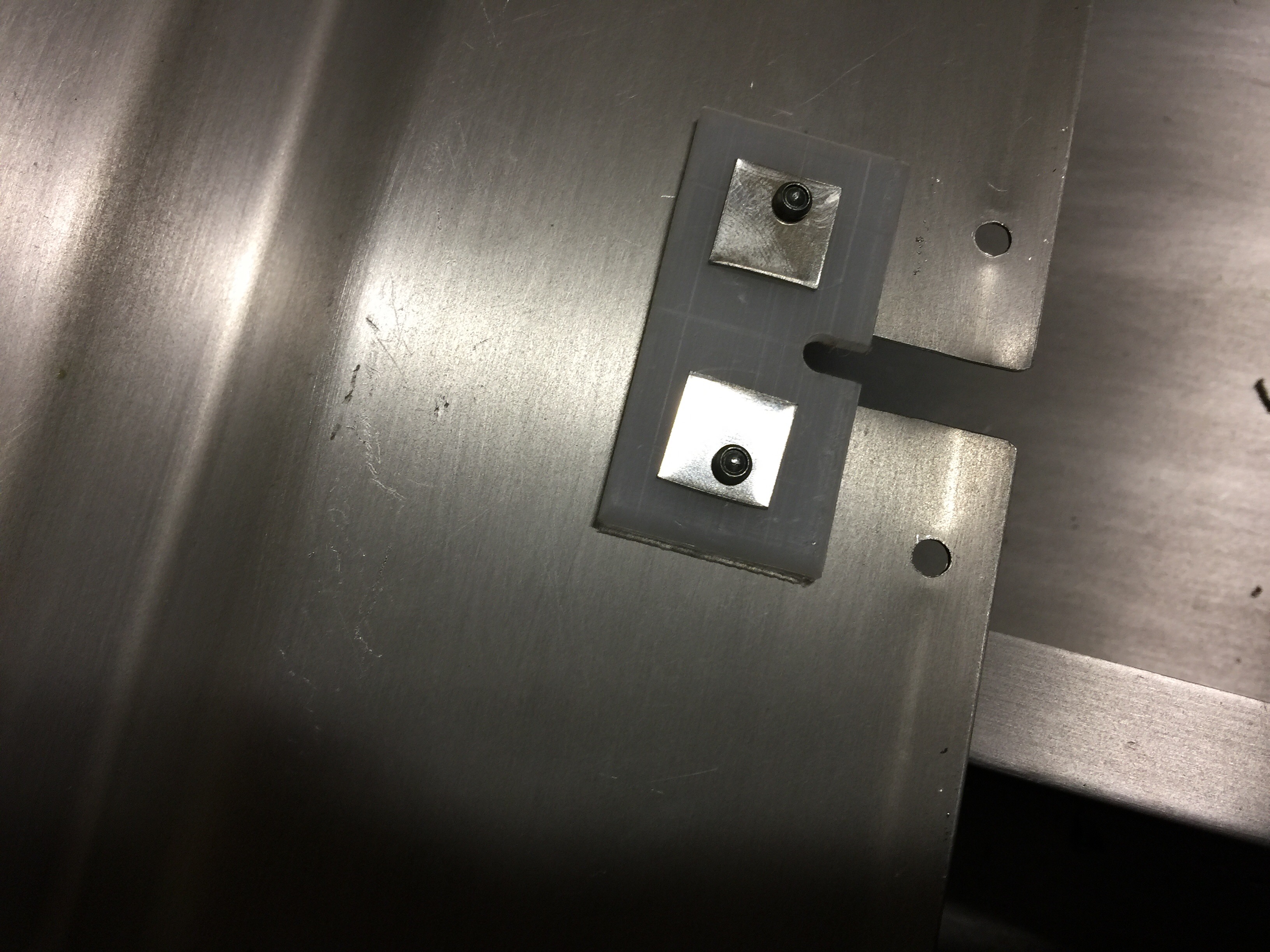 Here I’ve installed two nutplates that allow the top baggage panel to attach to the lower one where the seatbelt cable passes through. There are two plastic wear blocks that prevent the cable from contacting the aluminum.