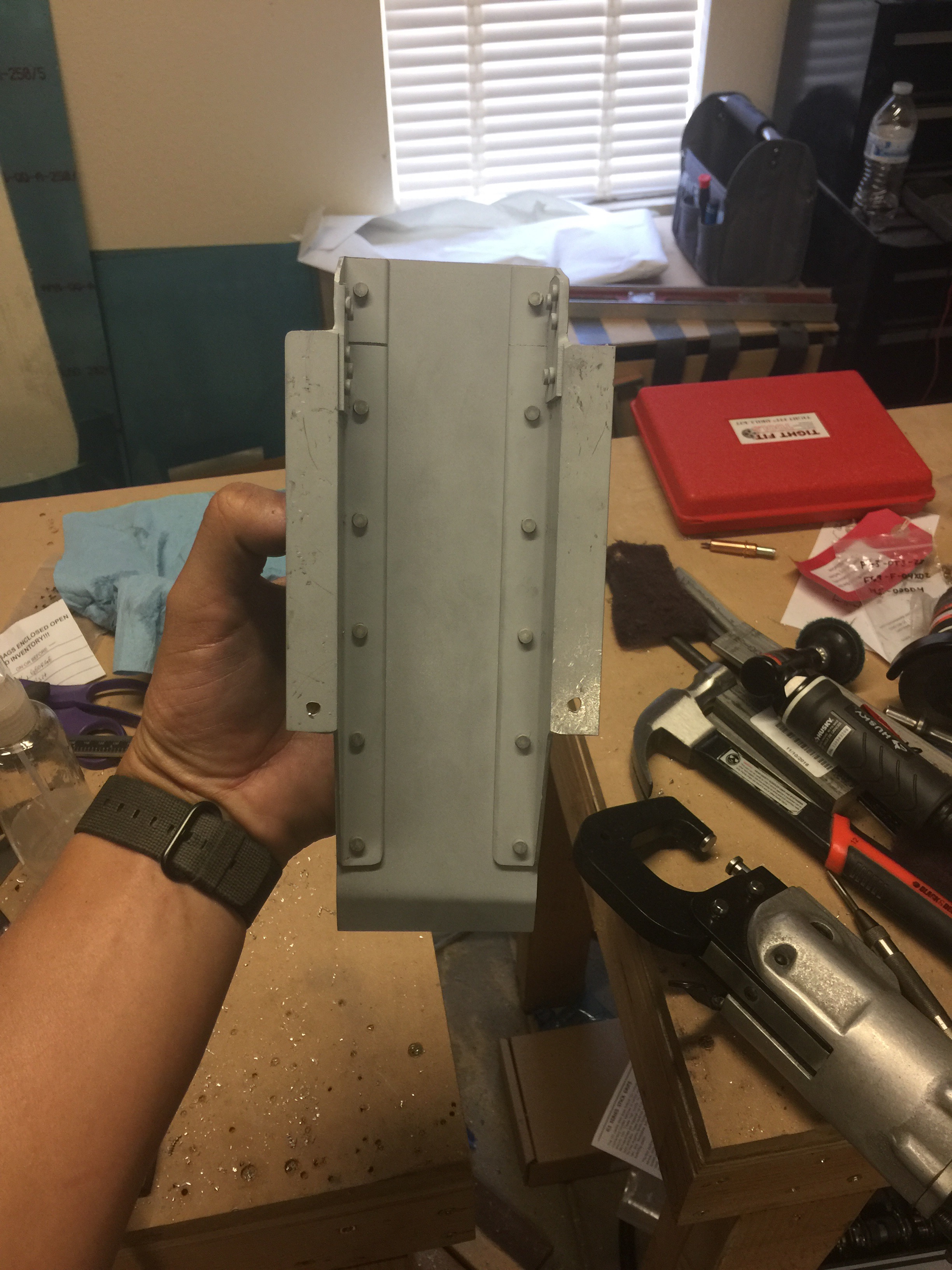 This is the cover primed and nearly ready to install. I spent time filling, sanding and smoothing down the rivets on the top plate, they are nearly invisible now that it’s primed.