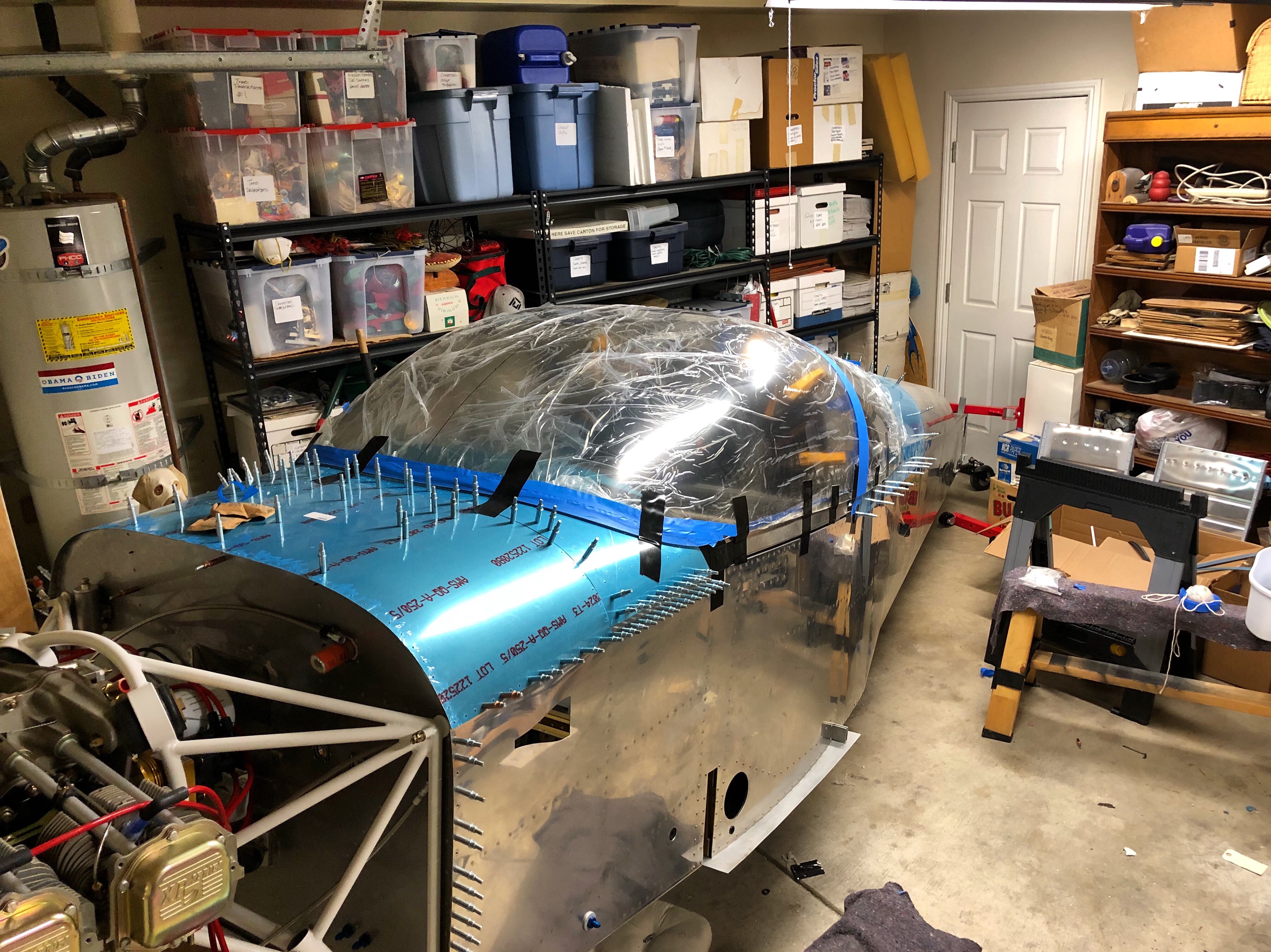 Here’s the canopy sitting on the plane for the first time. The forward flange is still very large and needed to be trimmed significantly.