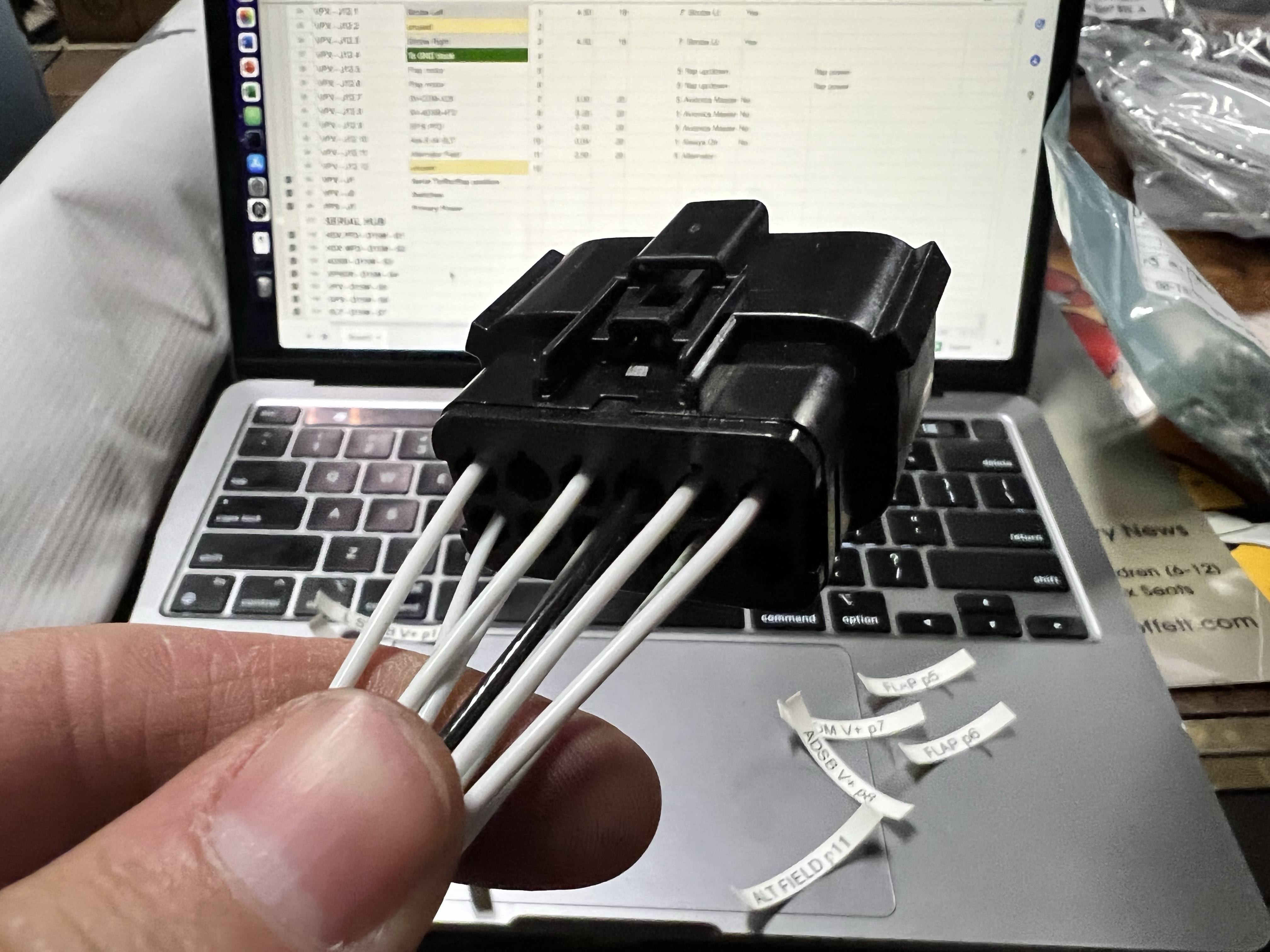 Today I spent a few hours working on the main power harnesses. Since I’m using the Vertical Power VPX, all the power wires connect to a central distribution point including the panel switches. It’s all very straightforward once you have the pins all planned out.