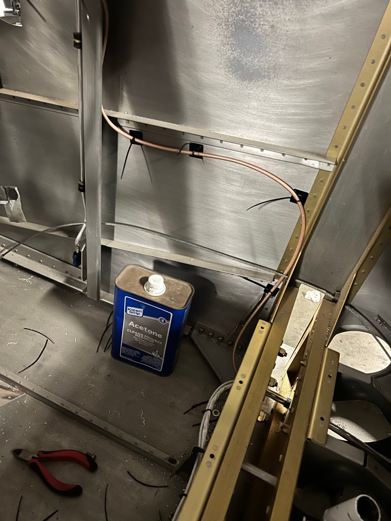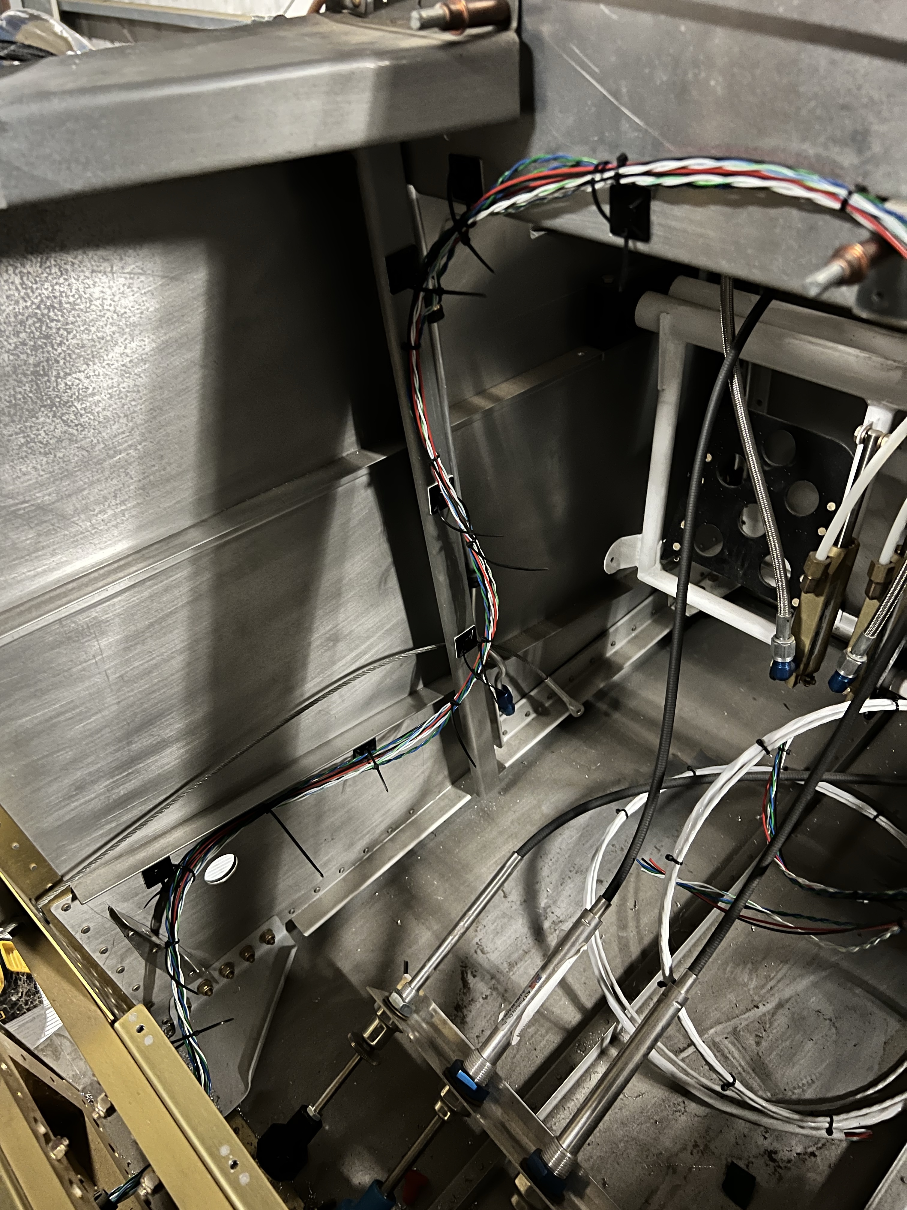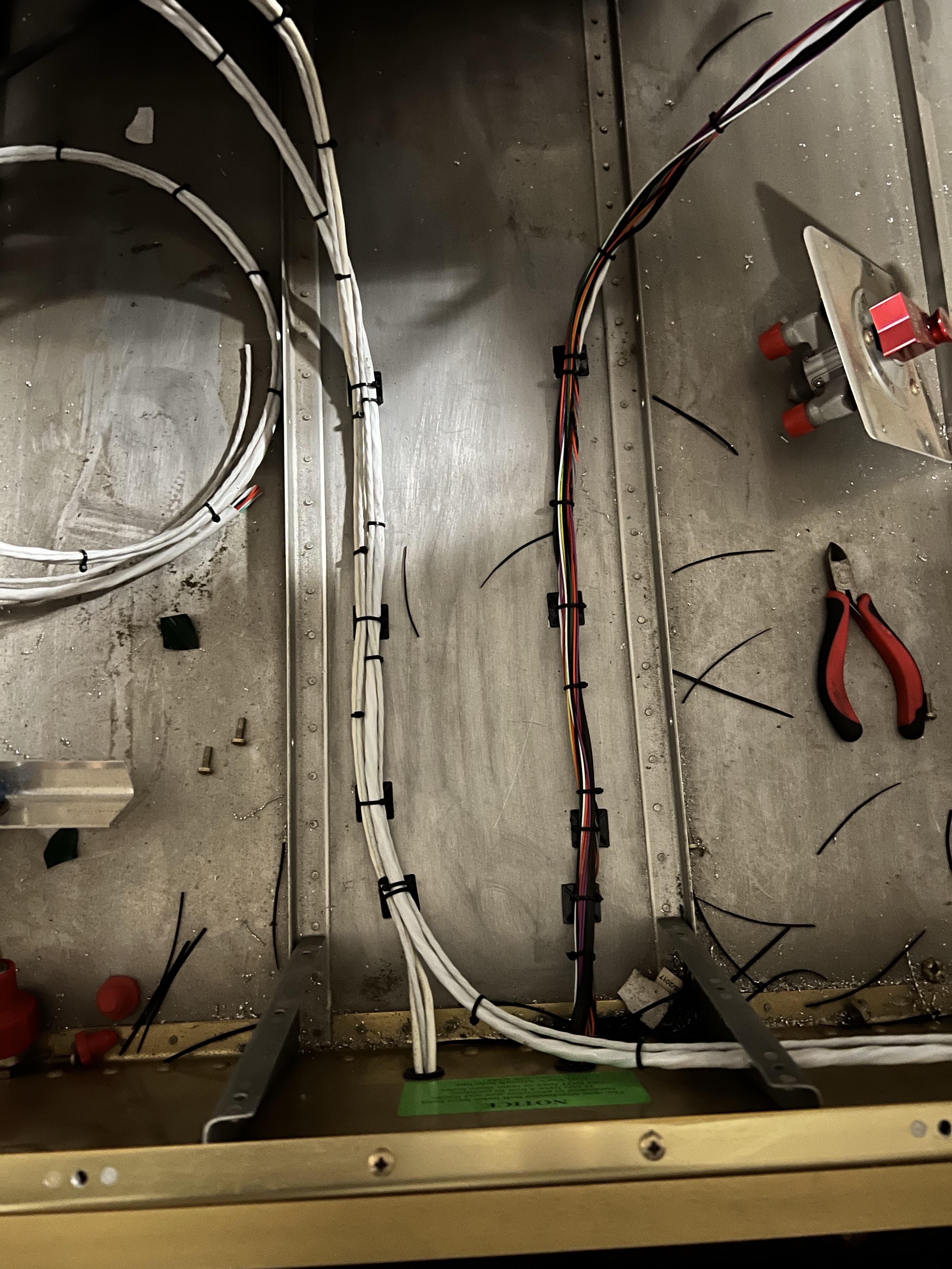 Today I did a lot of wire organizing in the forward section of the fuselage, under the panel. All of the cables routed from the aft fuselage and under the seats funnels into the center section and routes on the floor up to the panel.