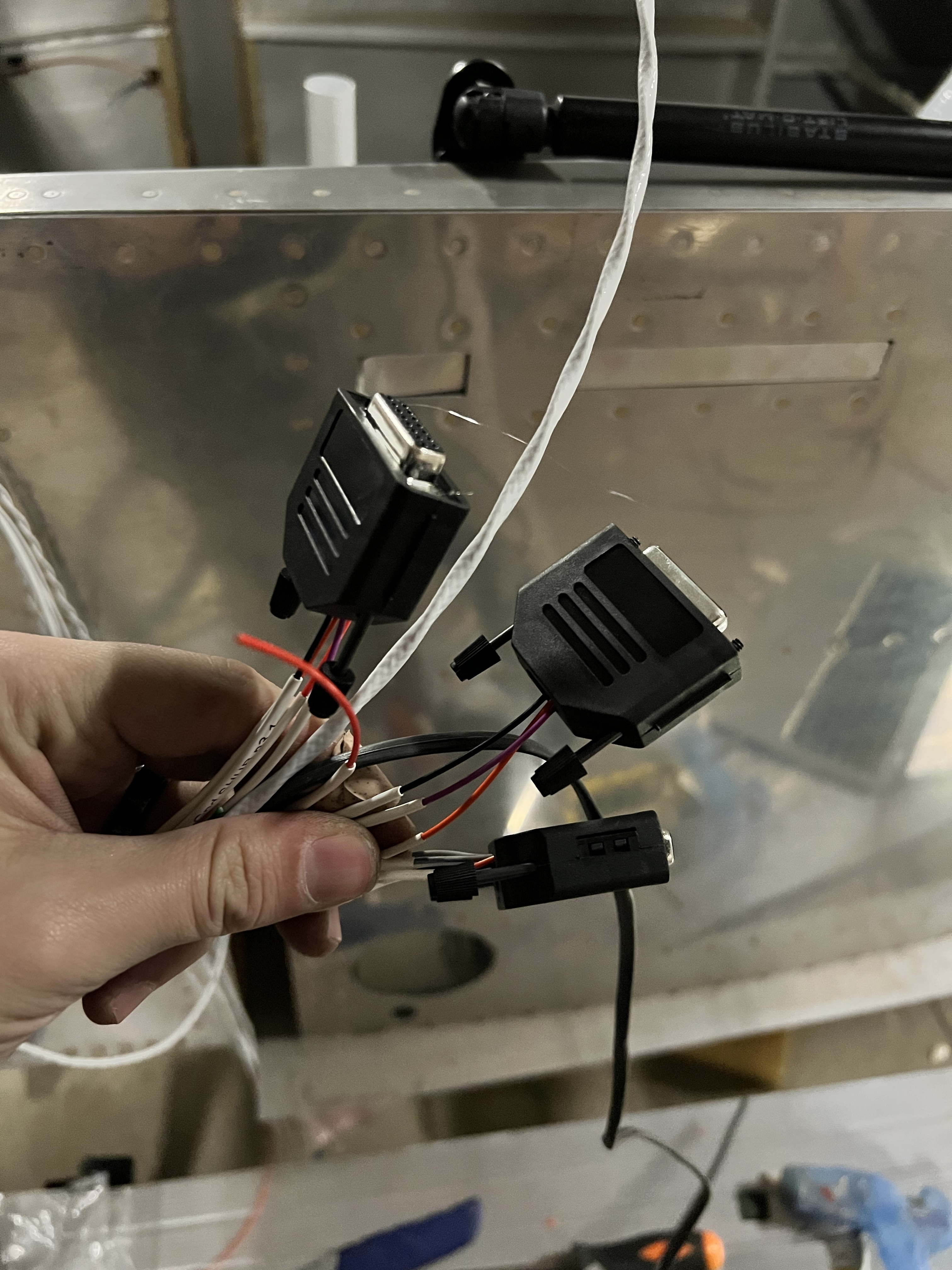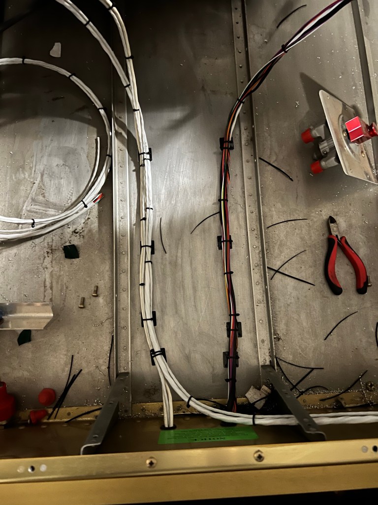 Once I organized the rats nest of wires I ended up with two nice bundles. These include the two trim motors, flap motor, ADSB, transponder, ELT, and ADHARS unit. These will be wired to the different serial and power connectors under the panel.