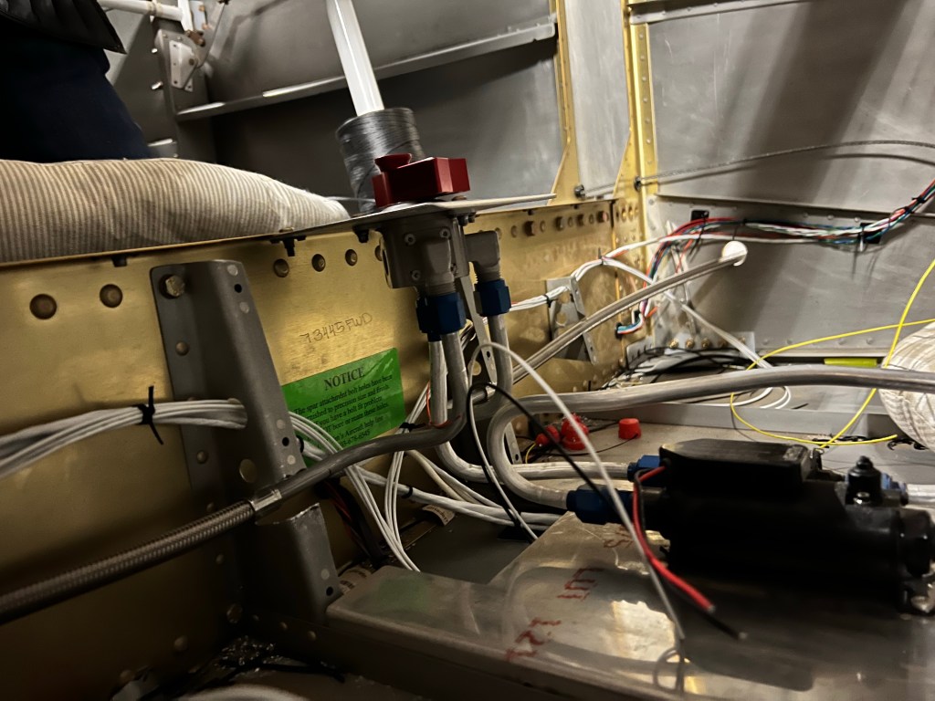 Once I finished with the wiring I wanted to test fit my fuel pump and selector valve. I have custom fuel hoses from TS Flightlines, so I had to modify the brackets to allow the hoses to fit (you can see the cut bracket on the left below the wires). Once I mount the wings, the two fuel hoses will attach to the fuel tanks.