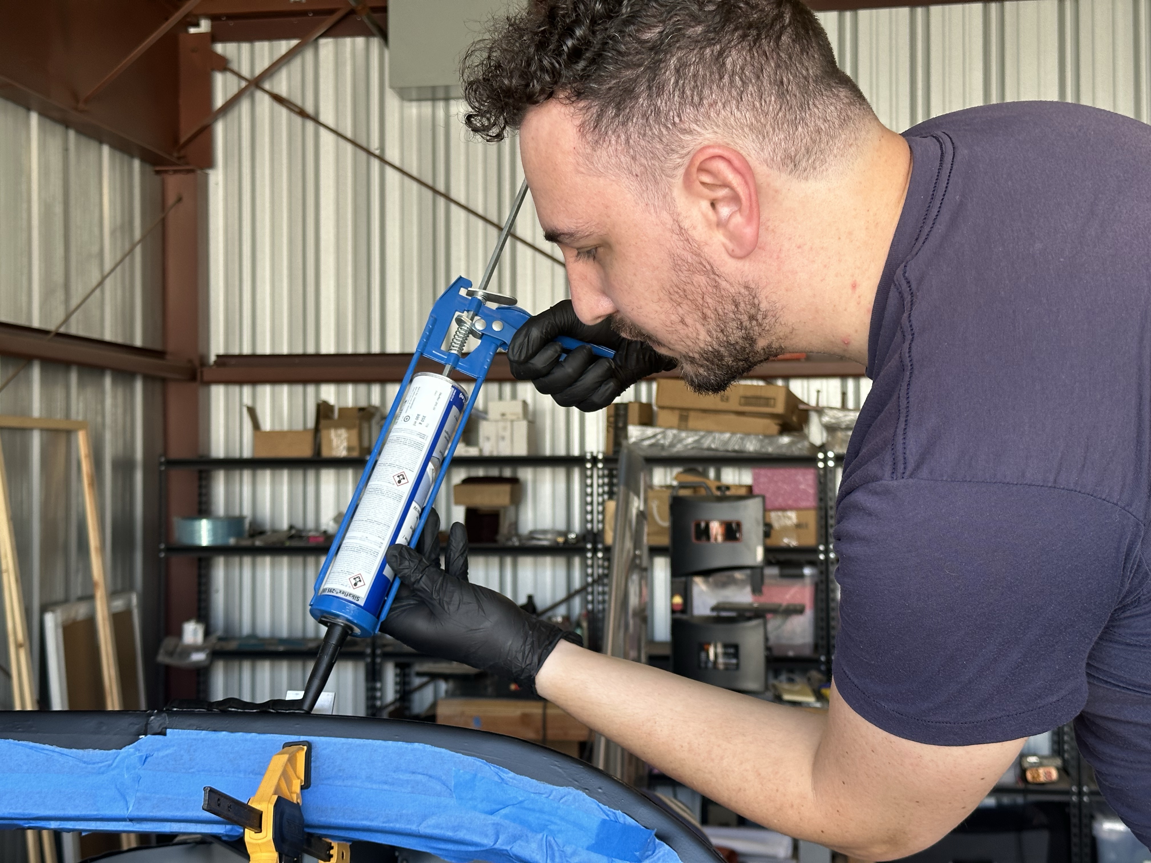 I started at the top of the frame and began applying the bead of Sika 295UV adhesive. I cut a V notch in the applicator tip in order to get the appropriate amount of glue for the bead. Sikaflex recommend 1/8” thickness to allow for thermal expansion.