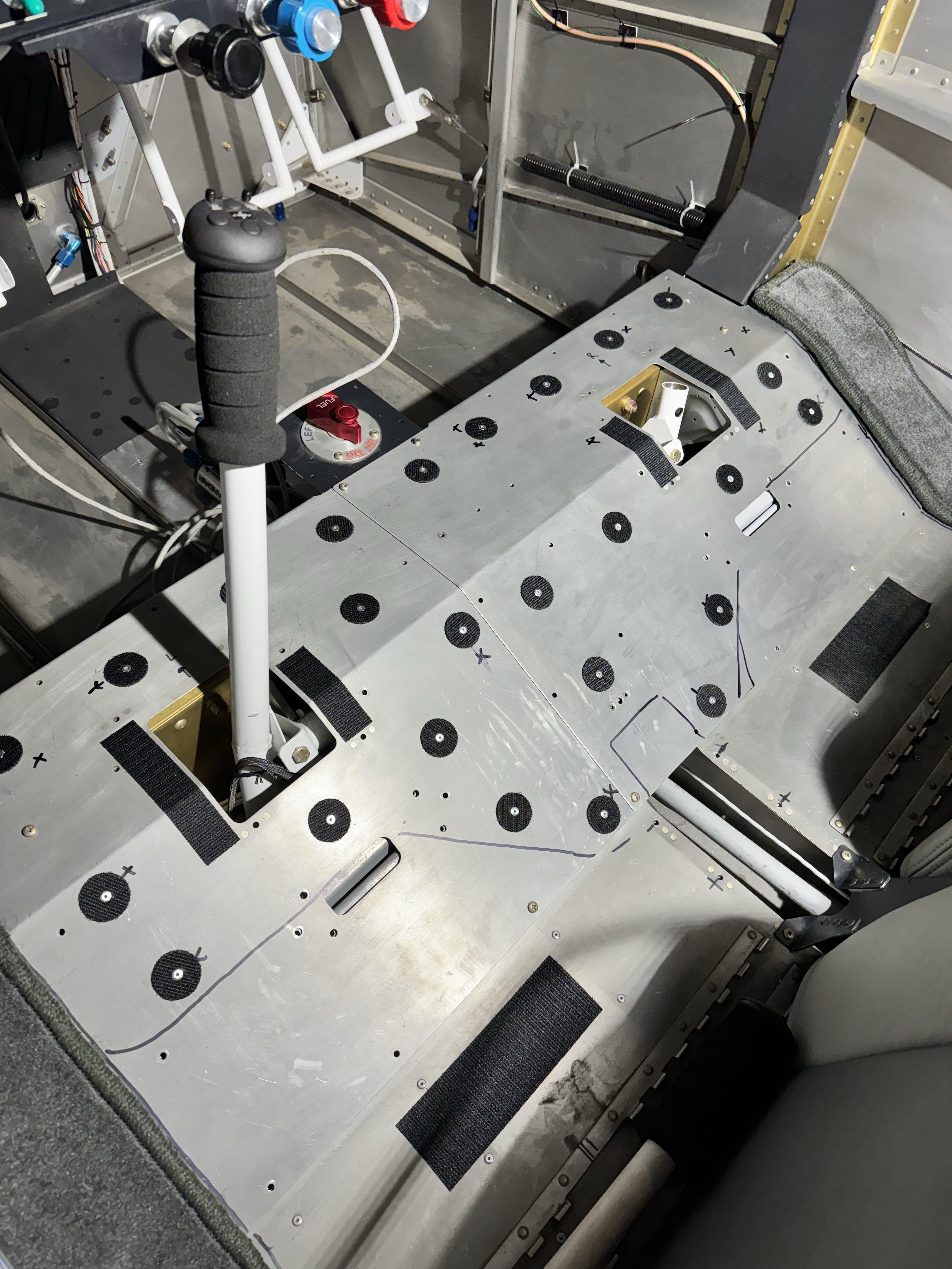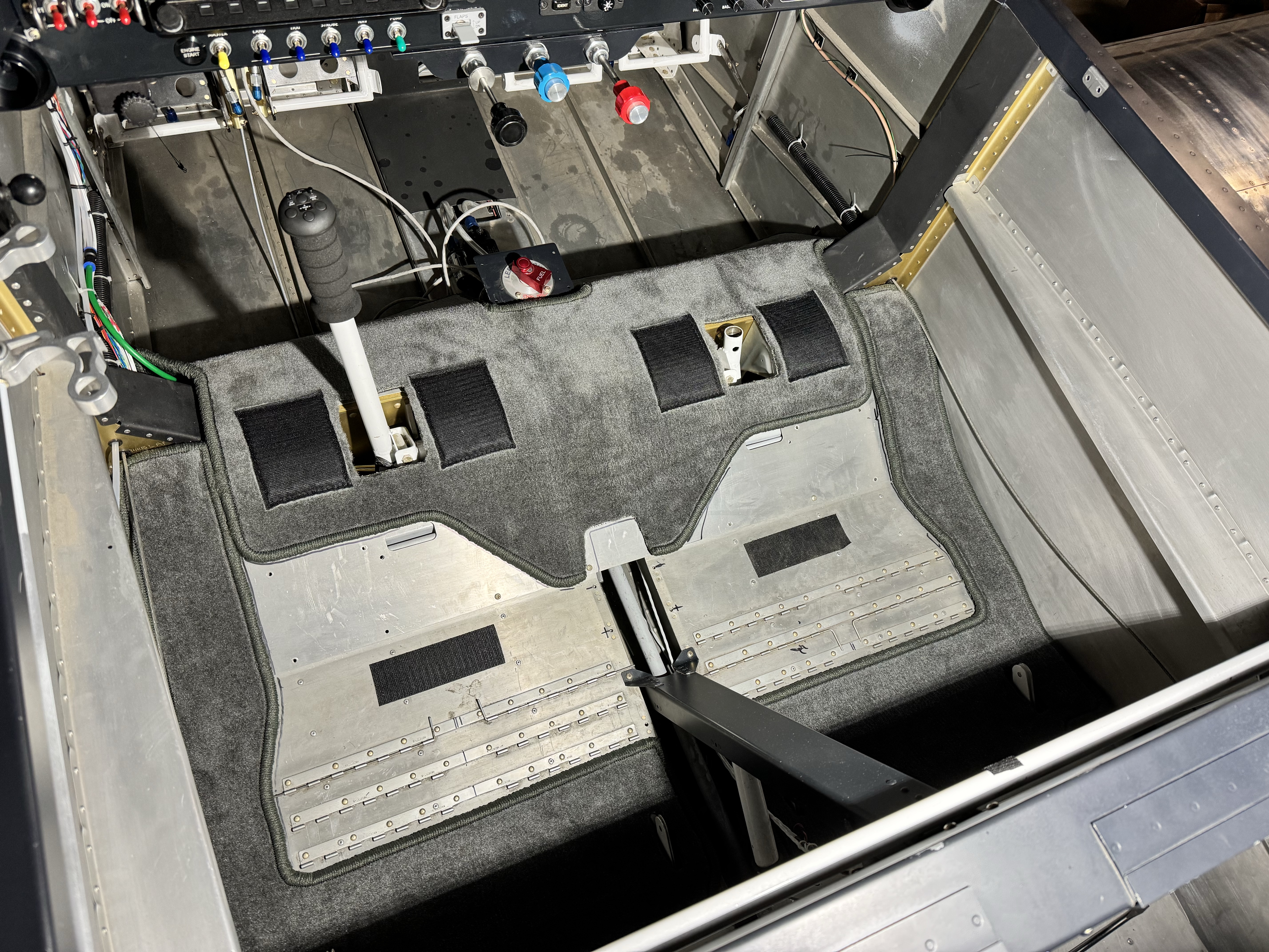I received some guidance on the installation process, so I began by laying out the carpet in the plane to mark the locations. I then installed the velcro chips (Velcoins) that are used to hold the carpet down. They are pop-riveted to the floor pans and then the carpet is attached.
