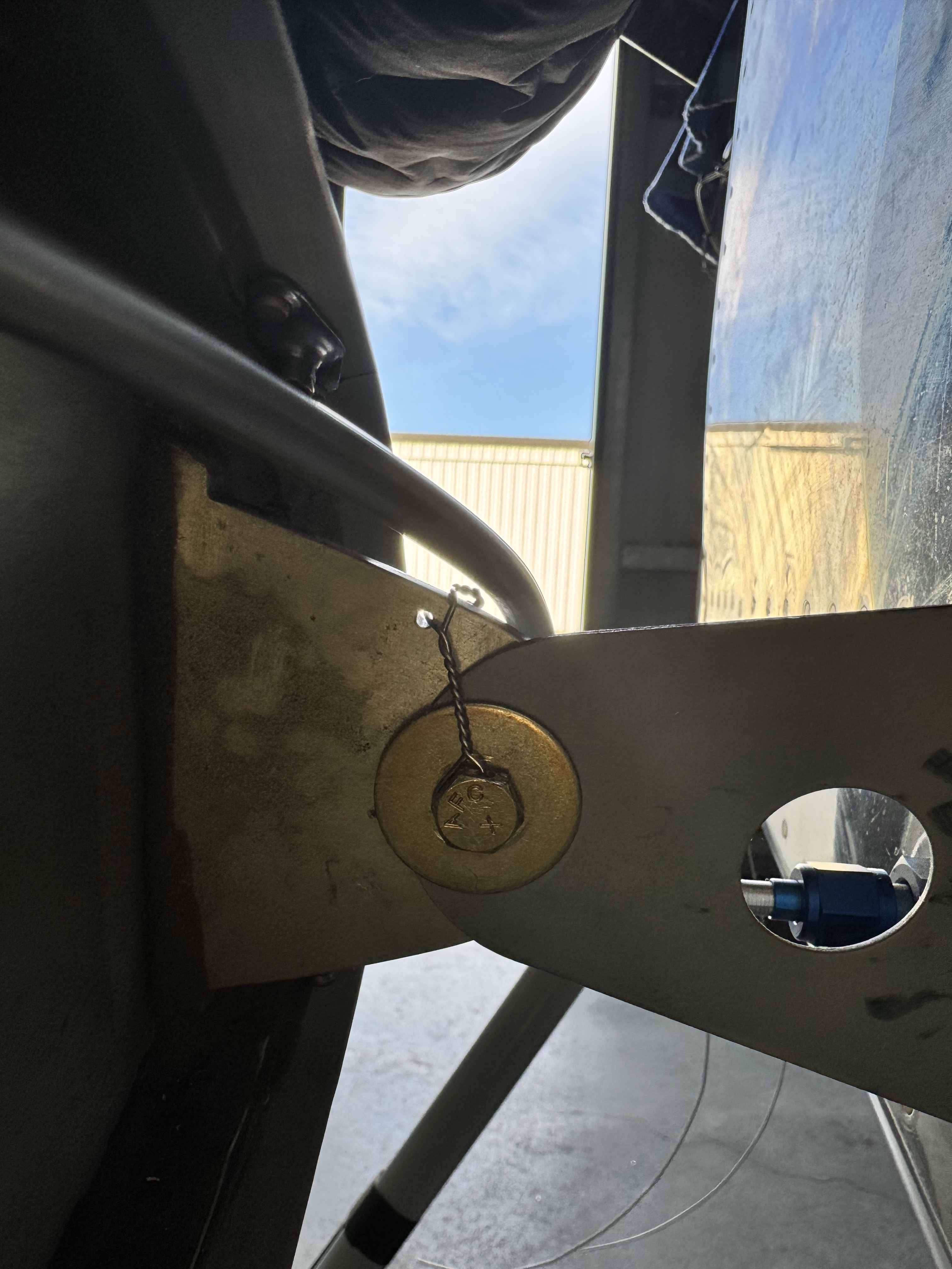 Next I drilled two holes in the fuel tank mounting bracket in order to attach the safety wire. These bolts are tightened snugly with a large washer in order to allow for separation from the fuselage in the event the wing is hit. The safety wire will prevent the bolts from prematurely backing out.