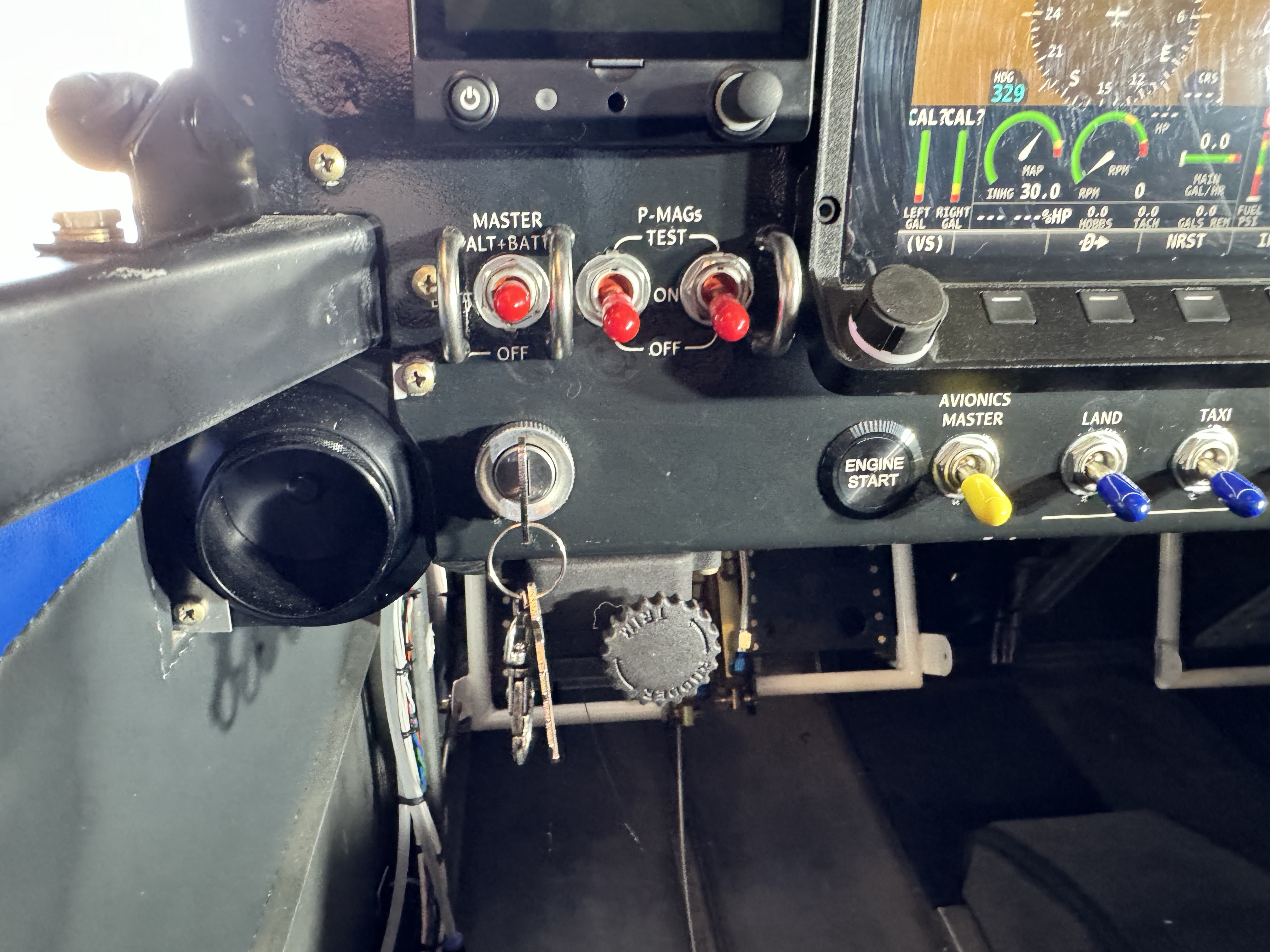 Up until now I had decided to not use a keyed ignition system, However I was talking to a hangar neighbor about avionics and panels and after talking with him for a while, I changed my mind and decided to add a key in line with the engine start button. The key is a 2 pole switch that essentially enables the engine start button to prevent accidentally engaging the engine starter. I’ve got some additional panel labels on order for the key and some other items that I have since added.