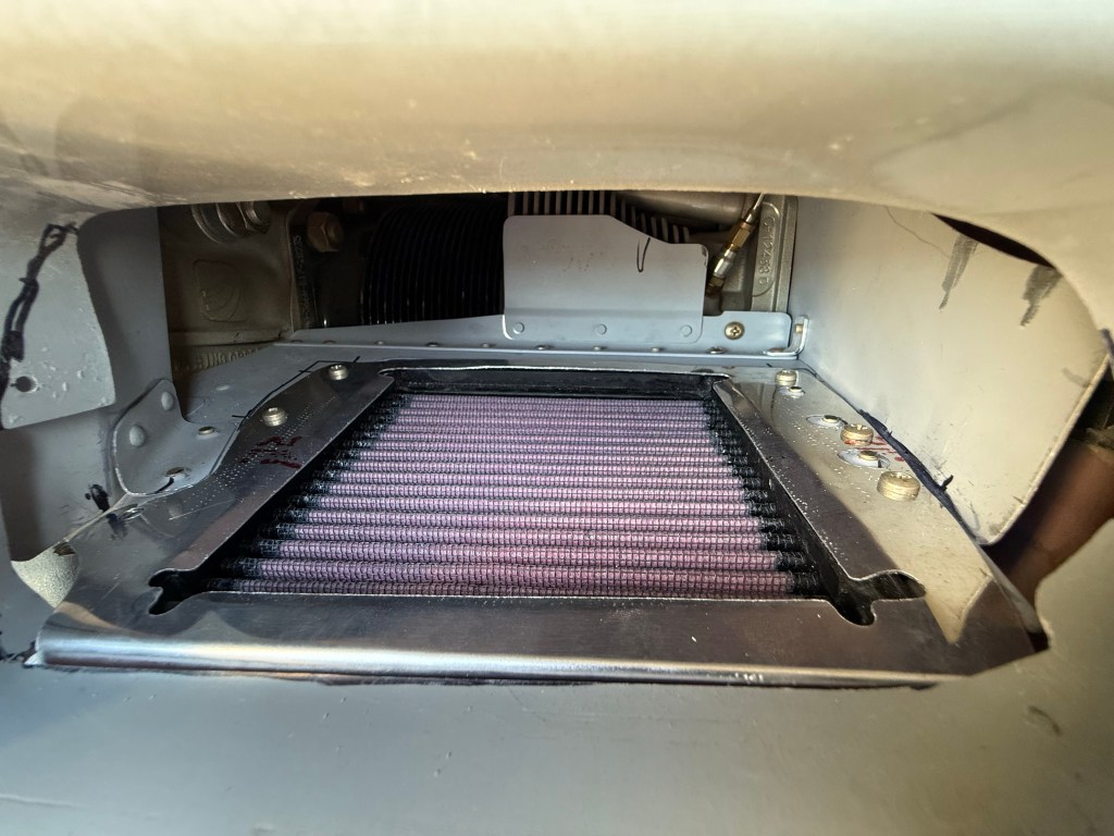 I then used the mounting bolts to install the snorkel to to the fuel servo, and the inlet ramp. I also fabricated the filter retaining bracket. The lower lip of the retaining bracket is folded down to provide some stiffness. The inboard edges are also bent down to apply a bit of pressure to the filter to prevent any movement.