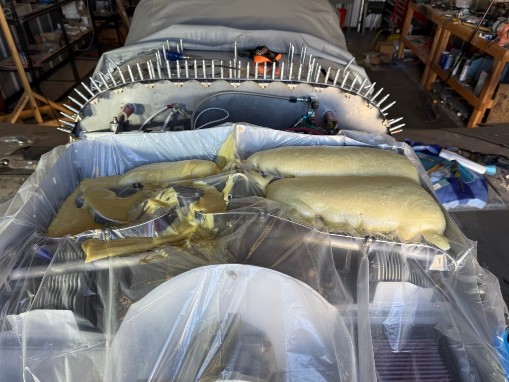 I started by laying down some plastic on the engine. I got some two part expanding foam, and mixed up a small test sample before doing the big pours. Once that went well, I mixed up a batch and began pouring it on the engine.