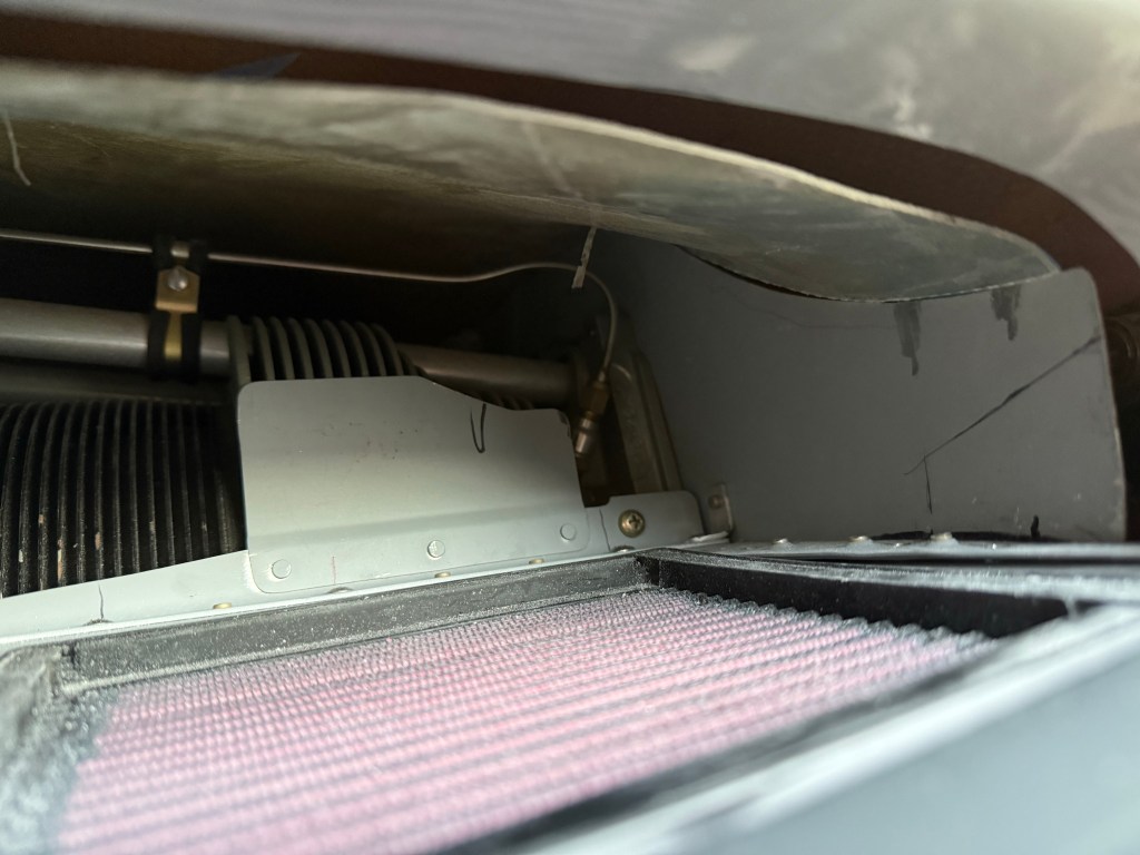 Here is the upper inboard side of the left inlet, the gap here is much better. the test gap seal fits much nicer around this side. On the lower side I will have to work the seal around the filter, which will likely result in an odd shaped seal.