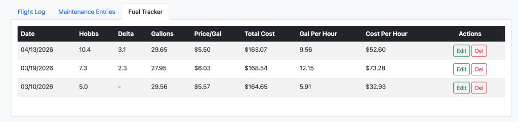 Part of the interface also has flight, maintenance, and fuel usage tracking. A lot of my initial flying has been at 75%+ power settings, often 80 or 85%, so I do expect to see some more efficiency gains in the future.
