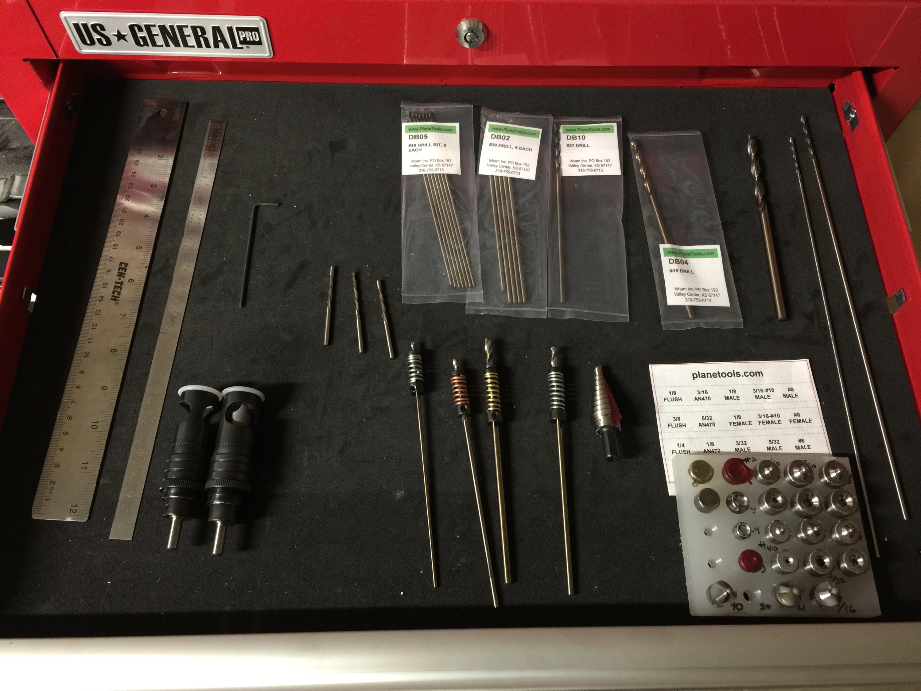 I have a set of 6″ 40 and 30 drill bits as well as other various sizes called out in the plans for the plane. I also have two countersink micro-stop cages, with four different size counter sink bits. I also have a set of dimples for all the hole sizes used on the plane.